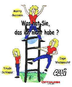 die drei frauen-typen zusammen ergeben die drei stufen des erfolges. (menschen können sich prima drei sachen merken !) dieser vorschlag war der erfolgreiche. schon das vorläufer model funktioniere prächtig und hunderte von motivierten kursteilnehmerinnen identifizierten sich mit "trude schlappi" und wollten zur "marry success" aufsteigen. |